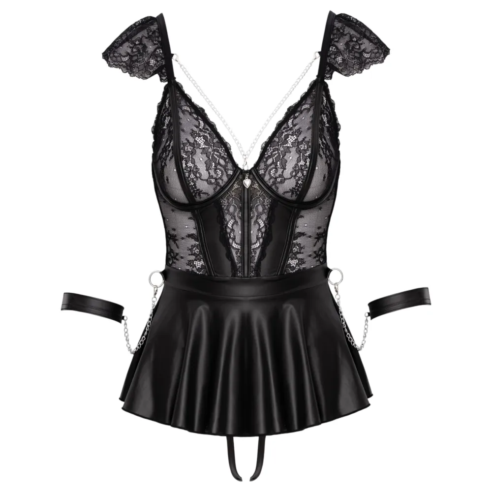 Tulajdonságok:fényes, rugalmas anyagból készült miniruhafinoman szabott mellrészkülönálló testhám és nyakpántállítható nyak és vállpántokkaltépőzáras kézrögzítőkkel és karikákkalszín: fekete, ezüst színű fém kiegészítőkkelanyaga: 90% Polyamid, 10% Elasthankímélő mosószeres vízben kézzel mosható, nem...