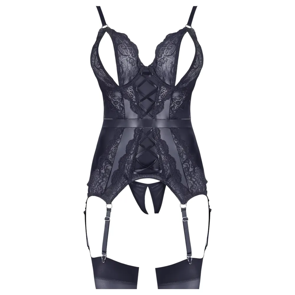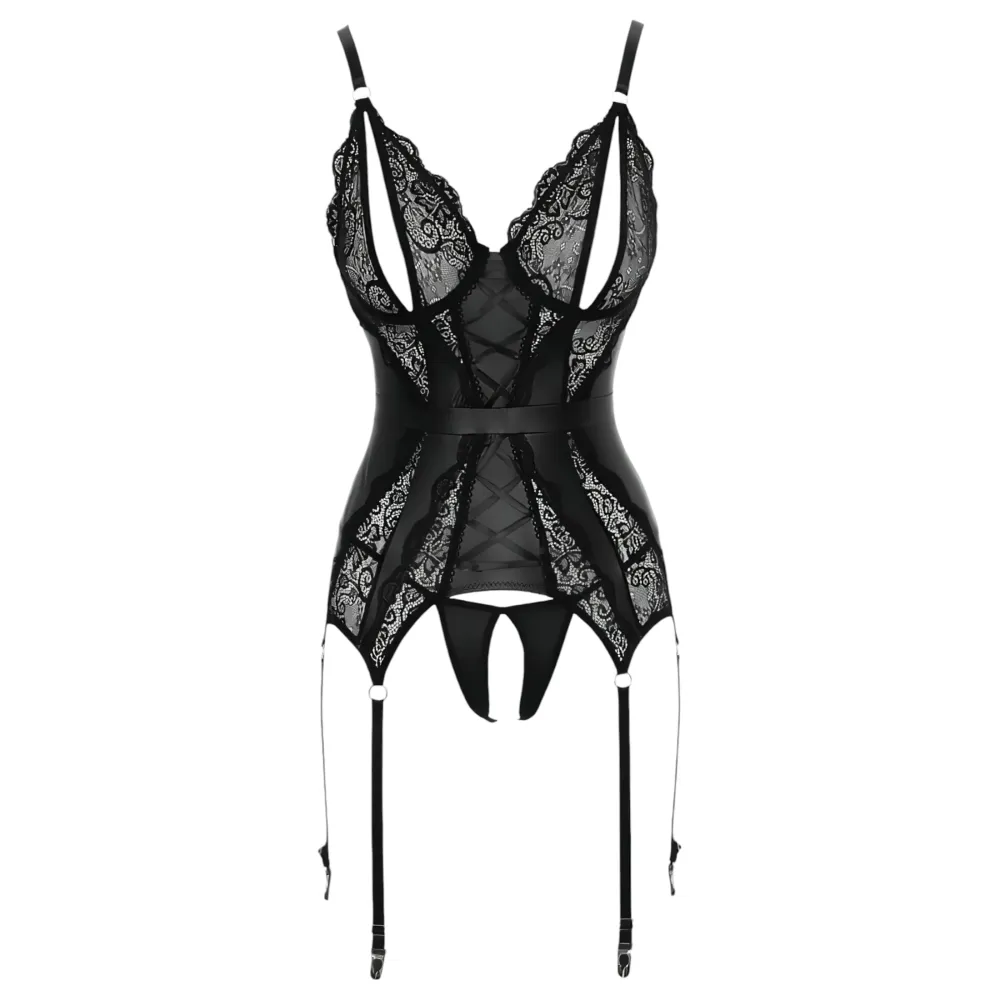Szaténos anyagból készült harisnyatartós felső, virágos csipke berakásokkal, hátul rugalmas, áttetsző anyagból. Nyitott mellrésszel, hozzáillő tangával. A váll- és harisnyatartó pántok állíthatóak.