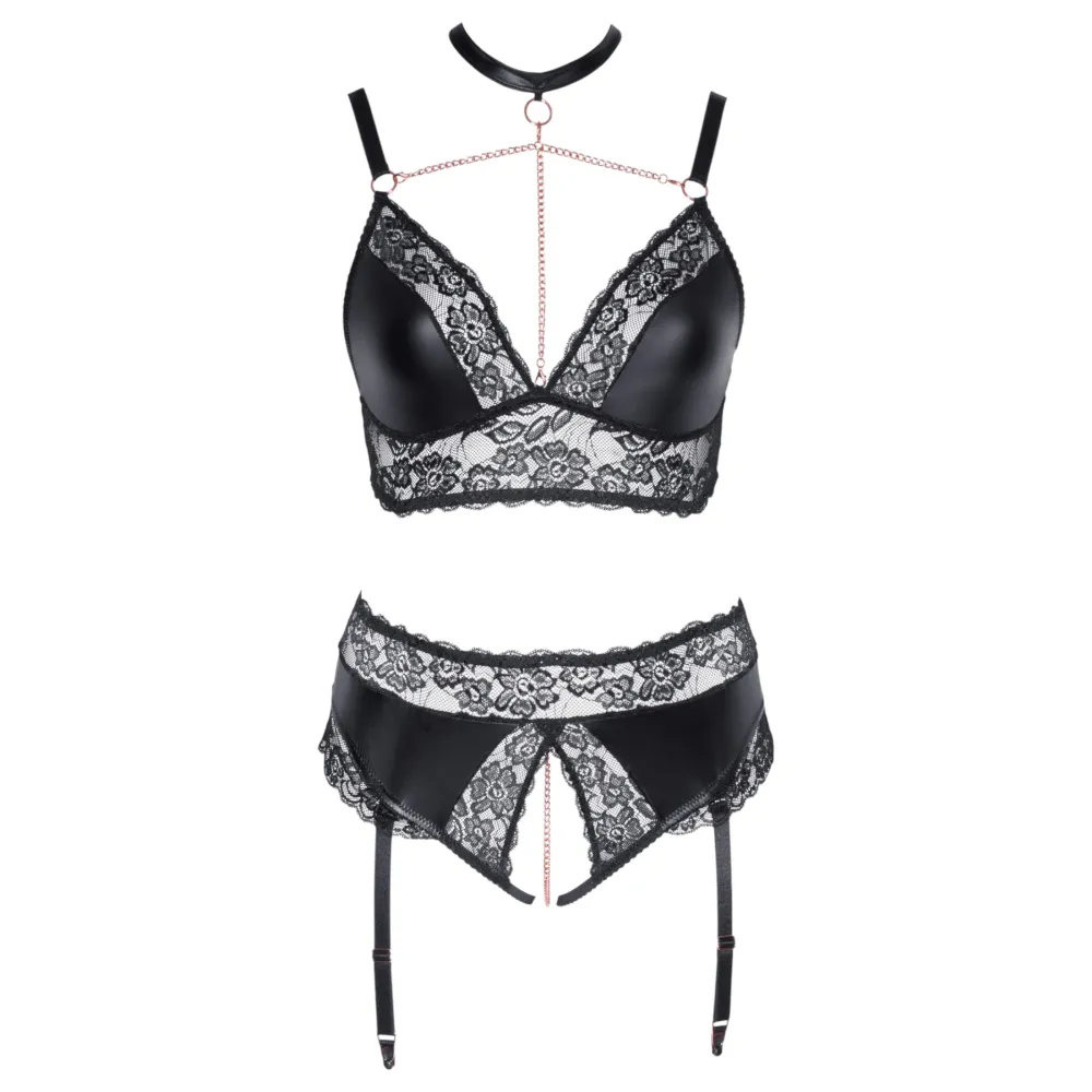 Állítható vállpántokkal készült, harisnyatartós felső, mély dekoltázzsal, állítható harisnyatartó pántokkal, hátul kapcsos kialakítással. szeméremnél teljesen nyitott, rugalmas pántos, csipke tangával, mely aktus közben is viselhető.
