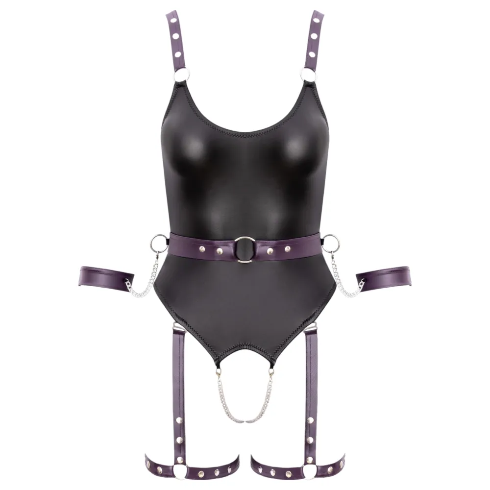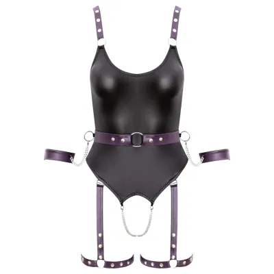 Bőrhatású anyagú body, elöl középen szegecses pántokkal és fém gyűrűvel díszítve.Ujjatlan fazonban, magas nyakkal.Hátul középen, a kebleknél és a szeméremnél is cipzárral.A derékrészen kétoldalt, fém rögzítő gyűrűk találhatóak, tépőzáras pántokkal, melyekkel.A harisnyatartó pántok állíthatóak.Anyaga...