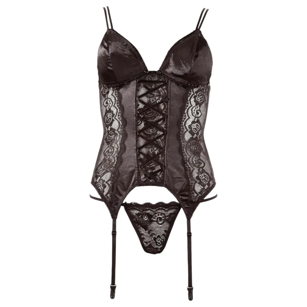 Hat részes szett. A mélyen dekoltált, rövidujjú fehér felső elöl fekete lakk gombokkal záródik. A harisnyatartós alsó fekete szaténból készül fodros, fehér csipkedíszítéssel. Szeméremnél végig nyitott, a nyílás mellett csipkeszegéllyel. A harisnyatartó pántok állíthatók és levehetők. A szett tartalm...