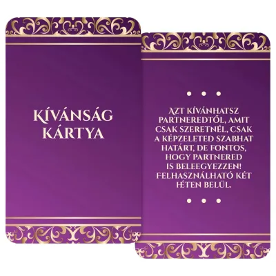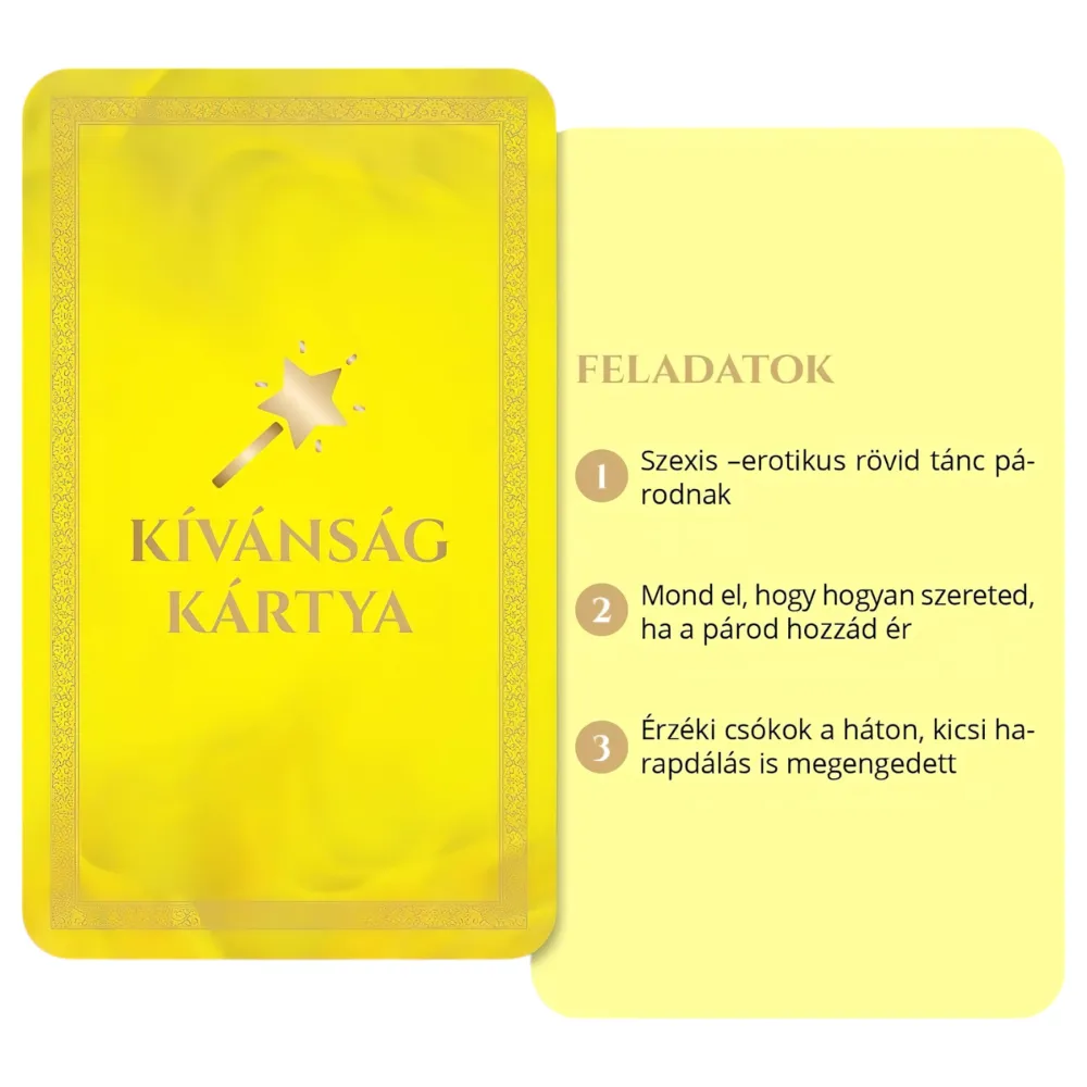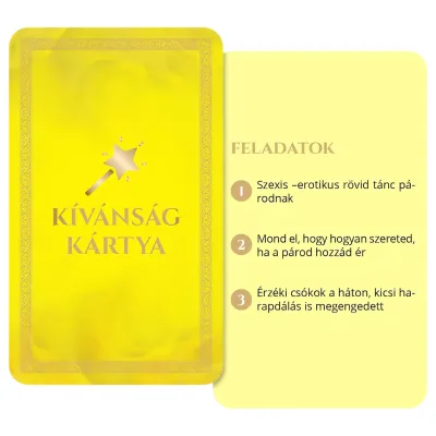 Érzékek Játéka - felnőtt szex társasjáték - Ára csak: 13 995 Ft. Rendeled meg most, és akár már HOLNAPRA házhoz szállítjuk! Vásárolj legalább 24 990 Ft-ért és a szállítási költséget átvállaljuk! Vibrációs termékekre egy év garanciát adunk! (részletek a vásárlási feltételekben). Ne feledd, a raktáron lévő termékeket futárszolgálattal egy munkanapon belül kiszállítjuk. A beszerzés alatt álló termékeket, pedig azonnal postázzuk amint beérkeznek a raktárunkba.