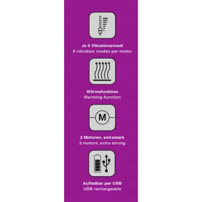 A csomag tartalma:1db Javida vibrátor1db mágneses USB-kábelTermék specifikáció, tulajdonságok:Szilárd vázon, bőrbarát, bársonyos anyagHárom motor - egy a makkban, egy a csiklóizgató karban + Turbo motor10 kalapálva lüktető mód a szárban és 10 pulzáló mód a csiklóizgató karbankülön vezérelhető funkci...
