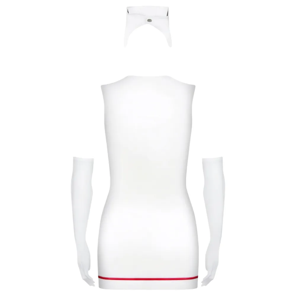Hosszanti csíkos, rugalmas anyagból készült, extra mini fazonú miniruha, állítható spagettipántokkal, elöl középen végig fehér gombokkal és lent két harisnyatartóval. Fehér galléros dekoltázzsal és fekete nyakkendővel.