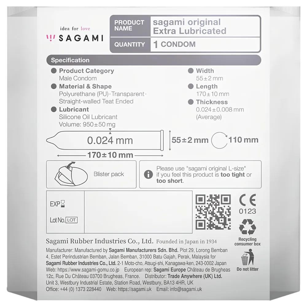 A csomag tartalma12 db Sagami Original extra síkosított 55 mm óvszerTerméktulajdonságokAnyag: polyuretán (PU)Szélesség: 55 mmVastagság: 0.028 ± 0.008 mmSzín: áttetszőÍzesítés: nincsSíkosítás: extra mennyiségűSzag: szagtalanCsomagolás: egyedi bliszteres kiszerelés