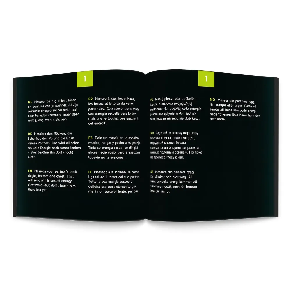 A csomag tartalma56 db feladatkártya (angol nyelven)24 db szívecske érme1 db dobókocka1 db szatén szemkötő1 db homokóra1 db játékszabály (angolul)TerméktulajdonságokNyelv: angolSúly: 155 gAnyag: papír, szatén, műanyagCsomag mérete: 18.5 × 3.5 × 26 cmJáték típusa: páros erotikus társasjáték
