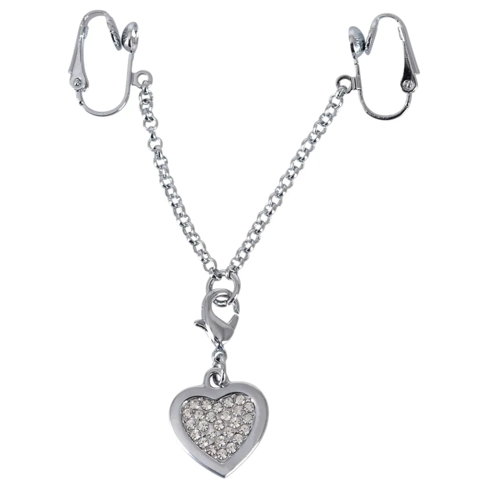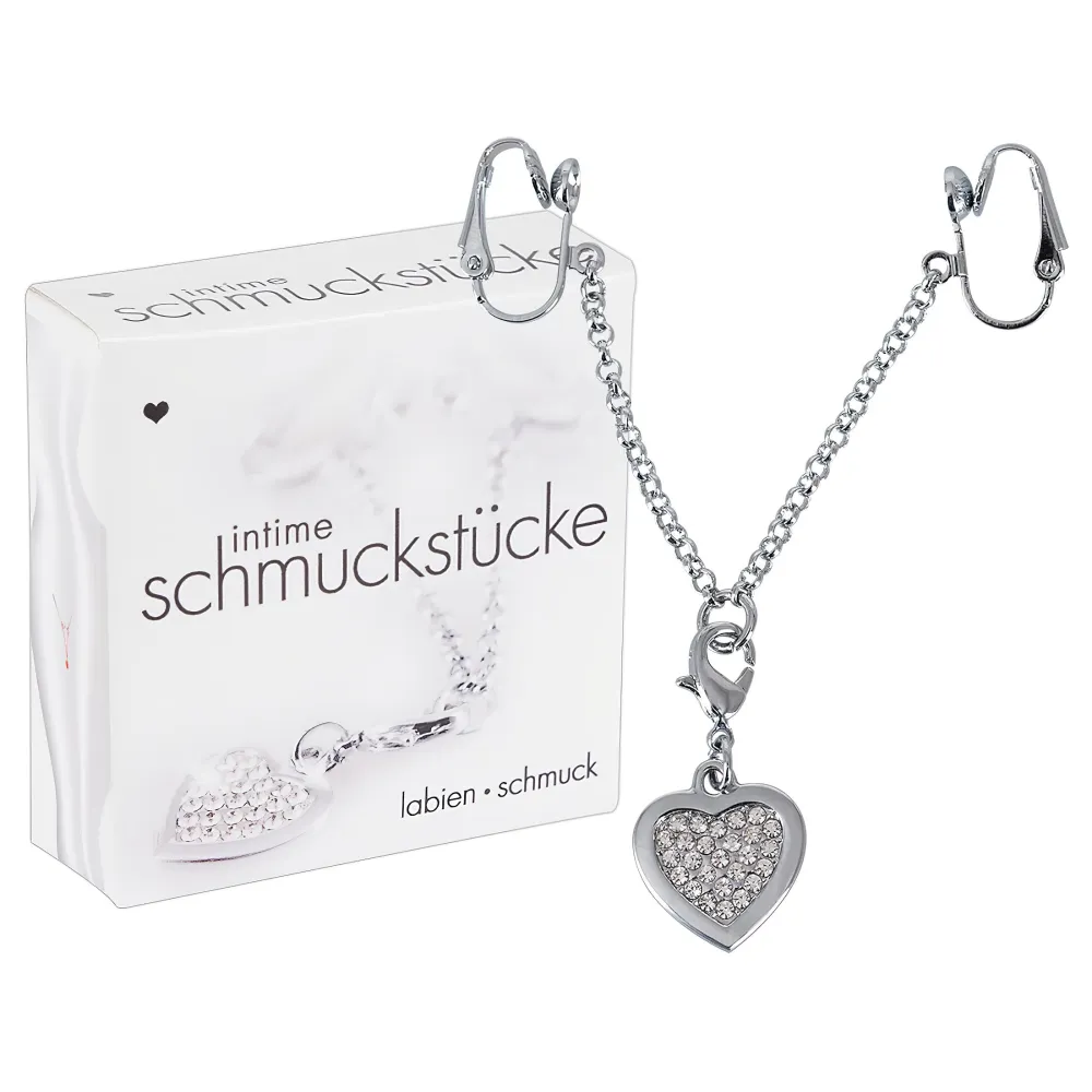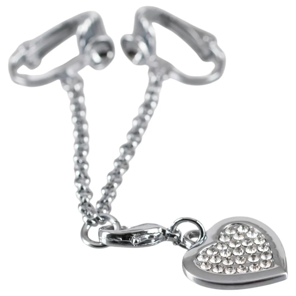 Engedd meg magadnak a luxus érzését ezzel a strasszos szíves intim ékszerrel, amely nemcsak egyedi megjelenést kölcsönöz, hanem különleges élményeket is nyújt. Az ezüst színű klipszek könnyedén csíptethetők a szeméremajkakra, és egy rövid lánccal vannak összekötve. A középen elhelyezkedő szív alakú medál apró, csillogó fehér strasszkövekkel van díszítve, ami garantáltan vonzza a tekinteteket.