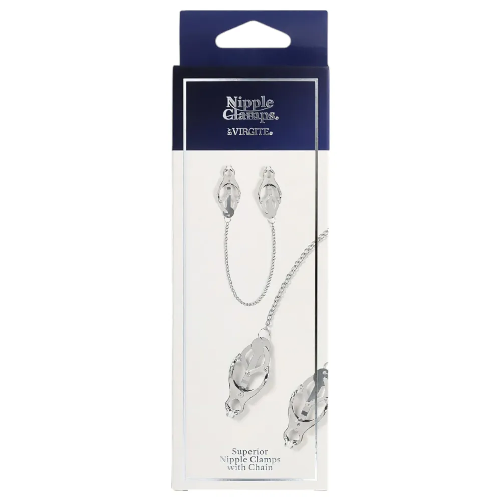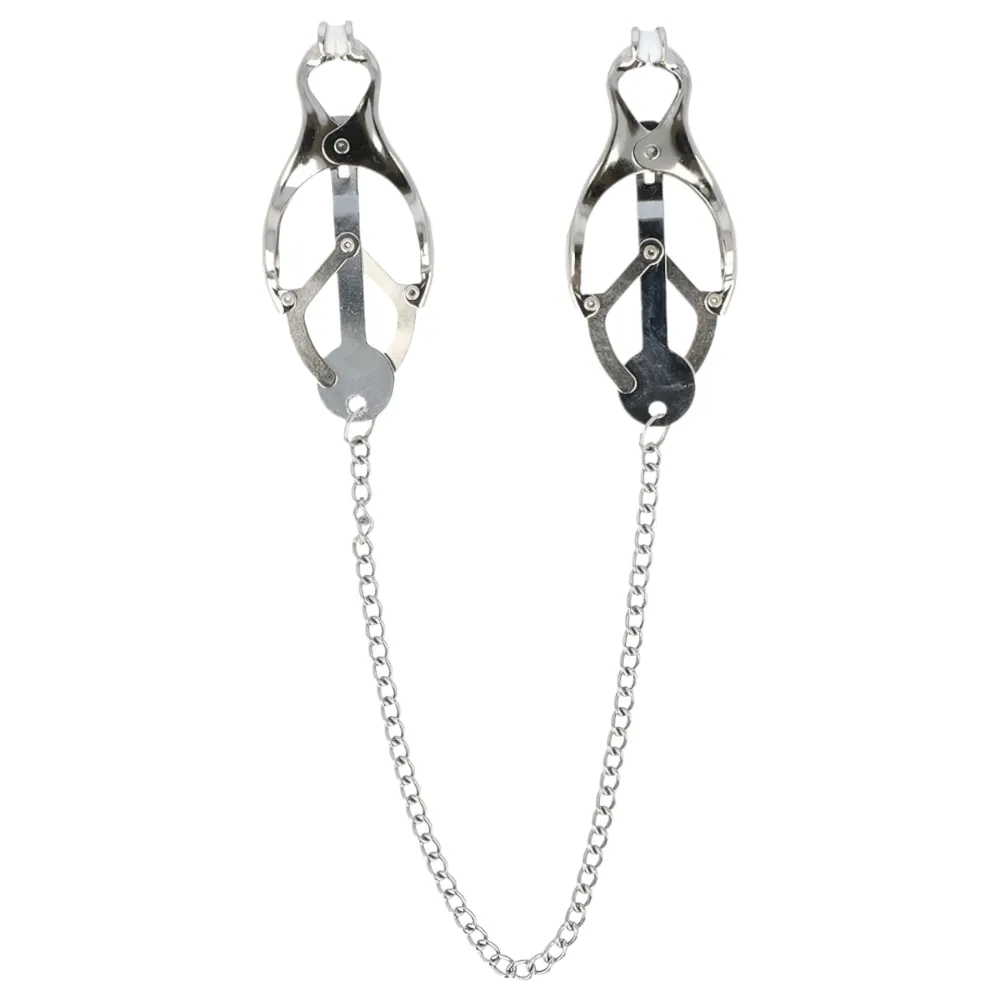 Csavarral állítható erősségű mellbimbó csipeszek, acél lánccal összekötve.Anyaga: Polycarbonat, Szilikon (csipeszek), acél (lánc), szénacél (csavarok).Fekete-lila-ezüst színben.Használati útmutató letöltése (PDF)